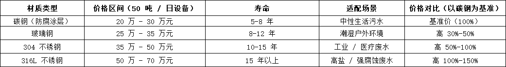 •醫(yī)療廢水:必須配備紫外線消毒系統(tǒng),罐體做防腐處理,價(jià)格比同規(guī)模生活污水設(shè)備高 20%-30%,10 噸 / 日設(shè)備約 8 萬元。