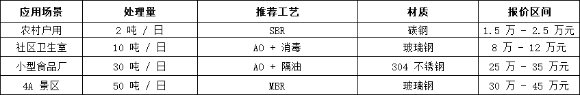 •微型設(shè)備(≤5 噸 / 日):適配農(nóng)家樂、獨(dú)棟辦公樓,采用 SBR 簡(jiǎn)易工藝 + 碳鋼材質(zhì),報(bào)價(jià)集中在 1.5 萬 - 5 萬元,如 1 噸 / 日農(nóng)村戶用設(shè)備約 2 萬元;