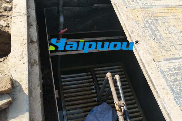 1、曝氣裝置可以固定在池底(需要做膜組件承托架和膜組件滑入導(dǎo)軌),也可以跟膜組件做在一起,各有優(yōu)劣,曝氣管的位置要做精心考慮,采用DN20穿孔管,每個(gè)膜片間隙對(duì)應(yīng)一路穿孔管,穿孔大小Φ2.0mm,穿孔間距100mm,相鄰兩路管穿孔位置交錯(cuò)穿插,孔口做單排垂直向上。