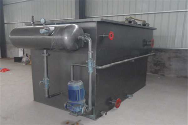 平流溶氣浮機(jī)將部分待處理水加壓至0.3-0.4兆帕,與壓縮空氣同時(shí)進(jìn)入容器罐,在容器罐中完成溶氣過(guò)程(空氣充分溶入水中)。溶氣水通過(guò)管道進(jìn)入安裝在氣浮池接觸室的溶氣釋放器。釋放器將溶氣水壓力突然降至常壓,釋放器釋放出微小的氣泡。氣泡與顆粒接觸粘附后,在氣浮分離室進(jìn)行固液分離。出水通過(guò)穿孔集水管均勻收集,送入下游處理單元。浮渣被刮渣機(jī)刮進(jìn)排渣槽,沉淀的污泥從污泥斗排出。